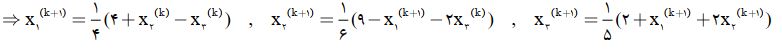 مثال) با استفاده از روش تکراری گاوس – سایدل جواب دستگاه معادلات زیر را به دست آورید. جواب اولیه را بردار صفر در نظر بگیرید و محاسبات را با 4D انجام دهید.بریم سراغ حل این مثال:
